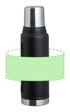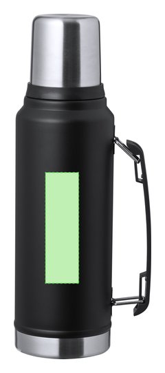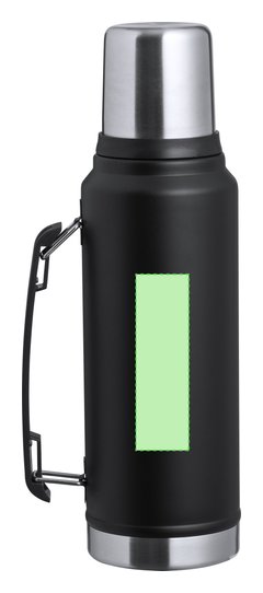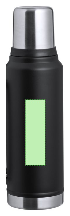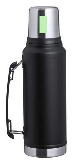 Termo de acero inox de 1L de capacidad. Combinación de color negro con acero pulido de elegante acabado, de cierre de rosca con tapón en forma de vaso de 200 ml y asa en el lateral para un fácil transporte. Presentado en caja de diseño kraft.