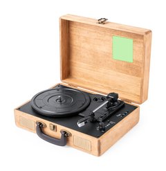Tocadiscos portátil presentado en un maletín fabricado en madera natural, con cierre de seguridad y asa de transporte. Compatible con discos de 33, 45 y 78 RPM y con adaptador central para singles de 7”. Brazo recto, con función de recogida automática cuando llega al final de cada cara del disco y funda protectora para la aguja cuando no se está usando. Conexión por Bluetooth@ y altavoces estéreo integrados de 3W de potencia, con función reproductor para conectar una memoria USB. Además, ofrece la posibilidad de digitalizar los discos de vinilo de manera sencilla. Salida estéreo RCA para conectar a dispositivos de sonido externos y botón ON/OFF con control de volumen. Incluye una batería interna de 1.200 mAh, pudiendo usarse en cualquier lugar sin necesidad de conectarlo a la red (cable de carga incluido). Viene en caja individual de diseño kraft, con manual de instrucciones en español e inglés.