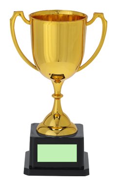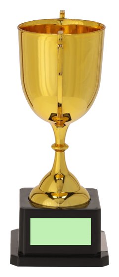 Trofeo con un elegante acabado brillante en color dorado, diseñado con amplias asas y una base en color negro para un toque distintivo.