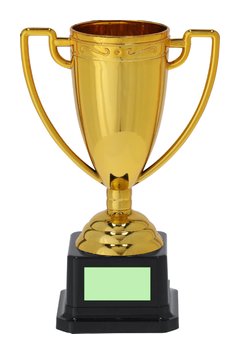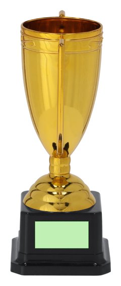 Trofeo con un elegante acabado brillante en color dorado, diseñado con amplias asas y una base en color negro para un toque distintivo.
