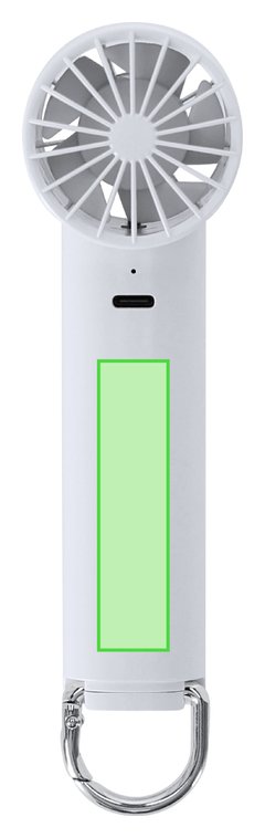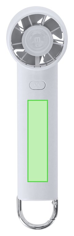 Ventilador portátil en ABS con acabado mate. Cuenta con botón de encendido/apagado y mosquetón de aluminio con función de soporte en el extremo inferior, ideal para un transporte cómodo. Dispone de 3 modos de velocidad. Potencia: 2–6 W. Batería recargable Li‑Ion 14500 de 1200 mAh y 3.7 V. Entrada USB‑C 5 V DC 1 A. Incluye cable USB‑A a USB‑C.