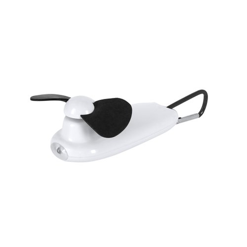 Ventilador con cuerpo en ABS con acabado brillante. Aspas en suave EVA. Con botón de encendido y apagado en el lateral, linterna en la parte superior con luces LED, y en la parte inferior incluye práctico mosquetón en mismo color que las aspas para fácil transporte- Funciona con 2 pilas AA, no incluidas.
