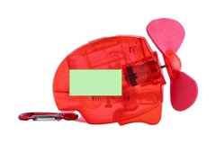 Ventilador vaporizador de 35 ml de capacidad. Presento con cuerpo translúcido y aspas de EVA. Se alimenta con 1 pilas AA (no incluidas). Disponible en colores variados, con un práctico mosquetón a juego. Presentado individualmente en caja.